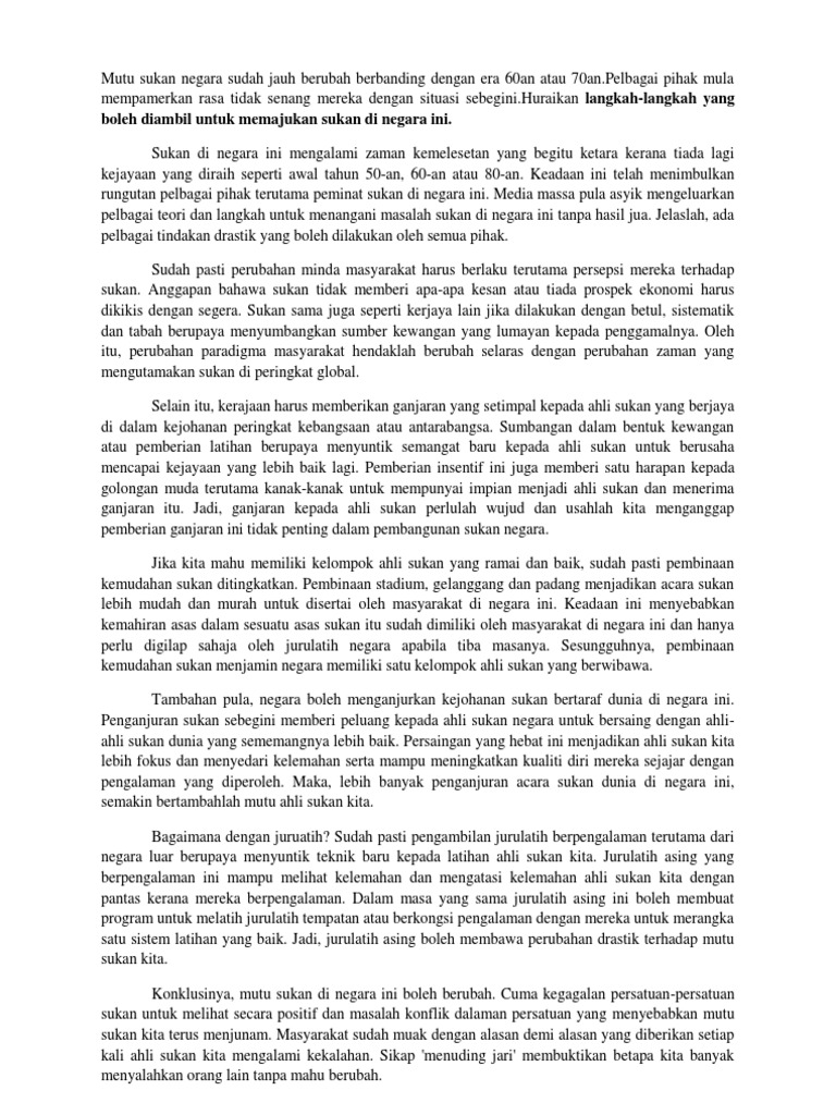 Contoh karangan sukan spm konu başlığında toplam 0 kitap bulunuyor. Kemukakan pendapat anda tentang kepentingan perpaduan kaum di negara kita. Simaklah berbagai contoh kata pengantar yang baik dan benar berikut ini. Sebagai konklusinya, penganjuran sukan yang bertaraf dunia akan membawa negara kita ke era kecemerlangan yang lebih membanggakan. Setiap pelajar diwajibkan menyertai aktiviti sukan di sekolah.